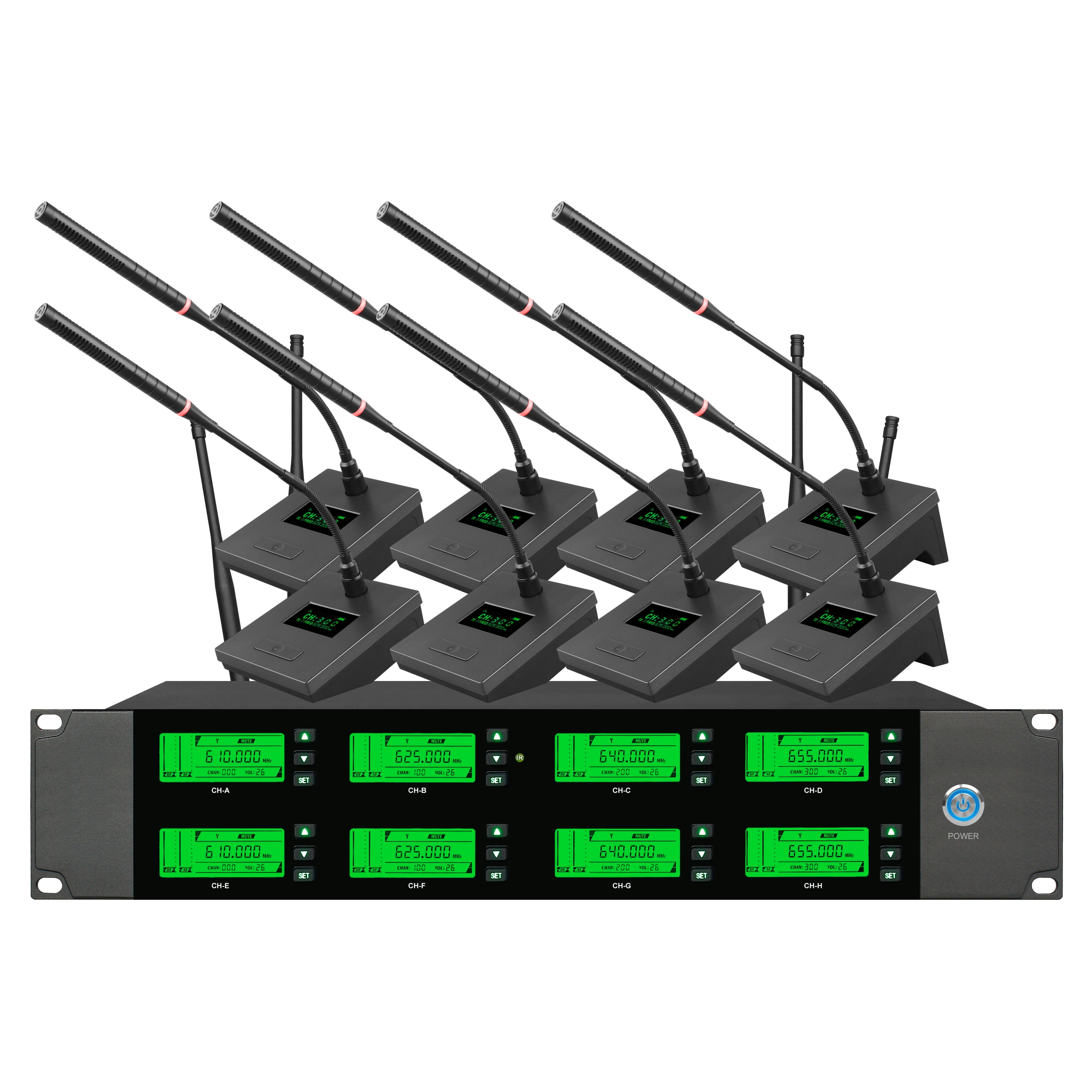 ● Wireless conference launching system, using two AA batteries, using high alkaline battery can be used for a long time (high power 10 hours, low power 14 hours). If you use rechargeable batteries, the service time will be reduced.